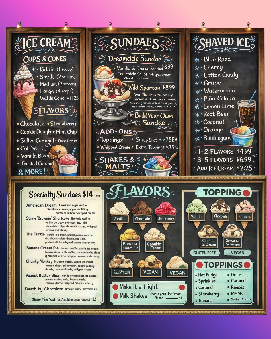 Elevate your business with hand-drawn menu boards designed for style and utility. We specialize in precision hand-lettering for headers and logos, available in framed or 3D-dimensional styles. Using water-resistant permanent inks for the main artwork, we leave pricing areas open so you can easily update daily specials with standard chalk and water without damaging the design.