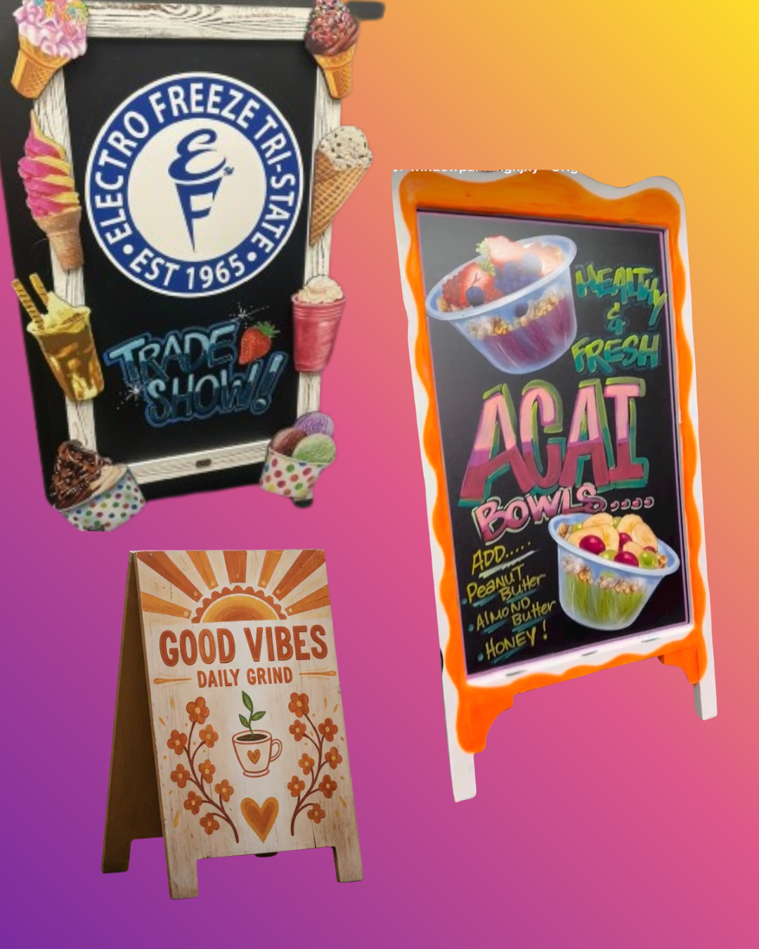 Stop more foot traffic with custom-crafted sidewalk signs built for high visibility. Available in a standard 2' x 3' format, our double-sided A-frames feature hand-painted or stained wood frames with optional 3D-dimensional headers and logos. Engineered for both indoor and outdoor use, these durable displays turn the sidewalk into an active invitation to your business.